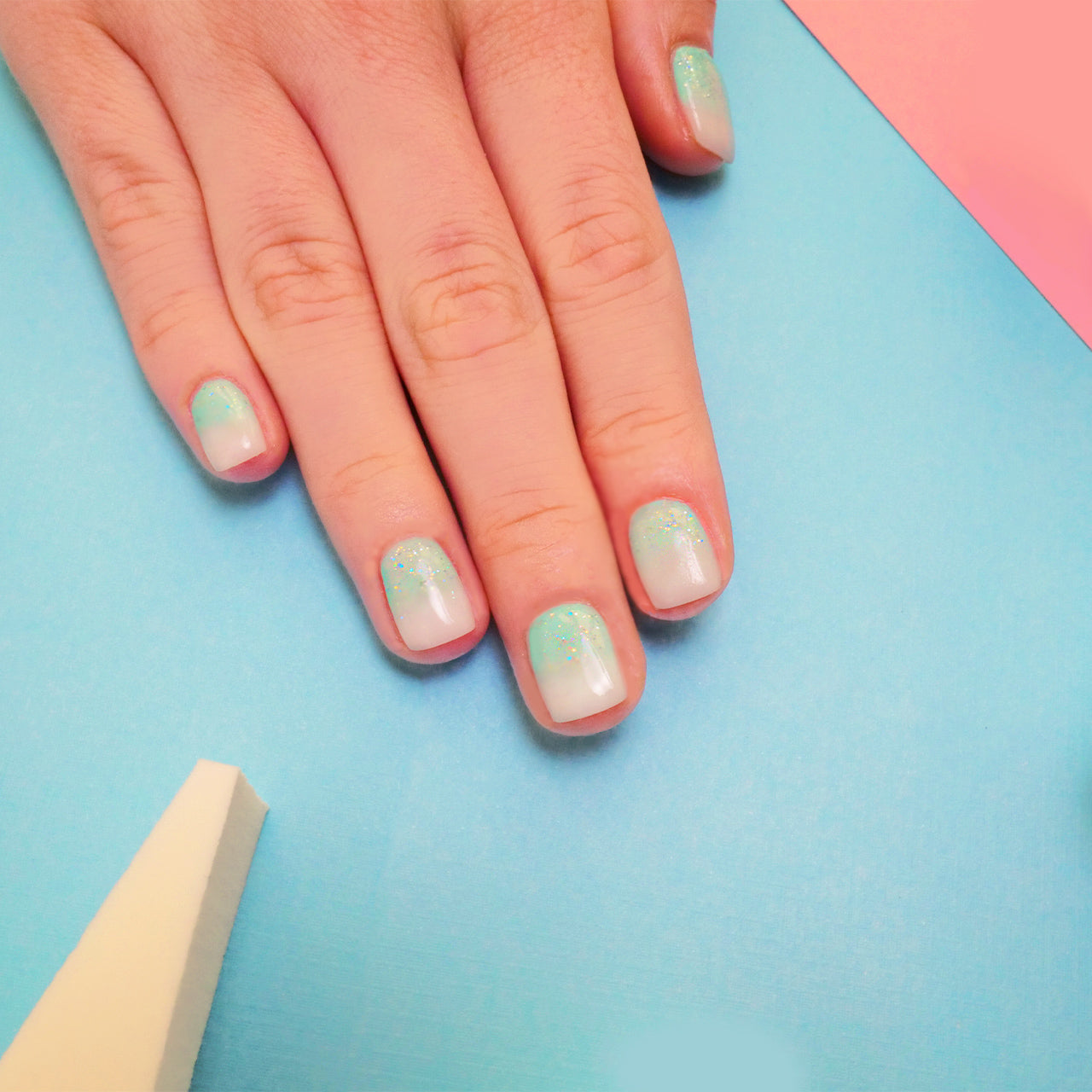 - Dann unser PAINT ART GEL TURQUOISE GREEN am Nagelbett mit einem Pinsel auftragen und mit unseren Schwämmen vorsichtig Richtung Nagelspitze verteilen und anschließend 60 Sekunden aushärten