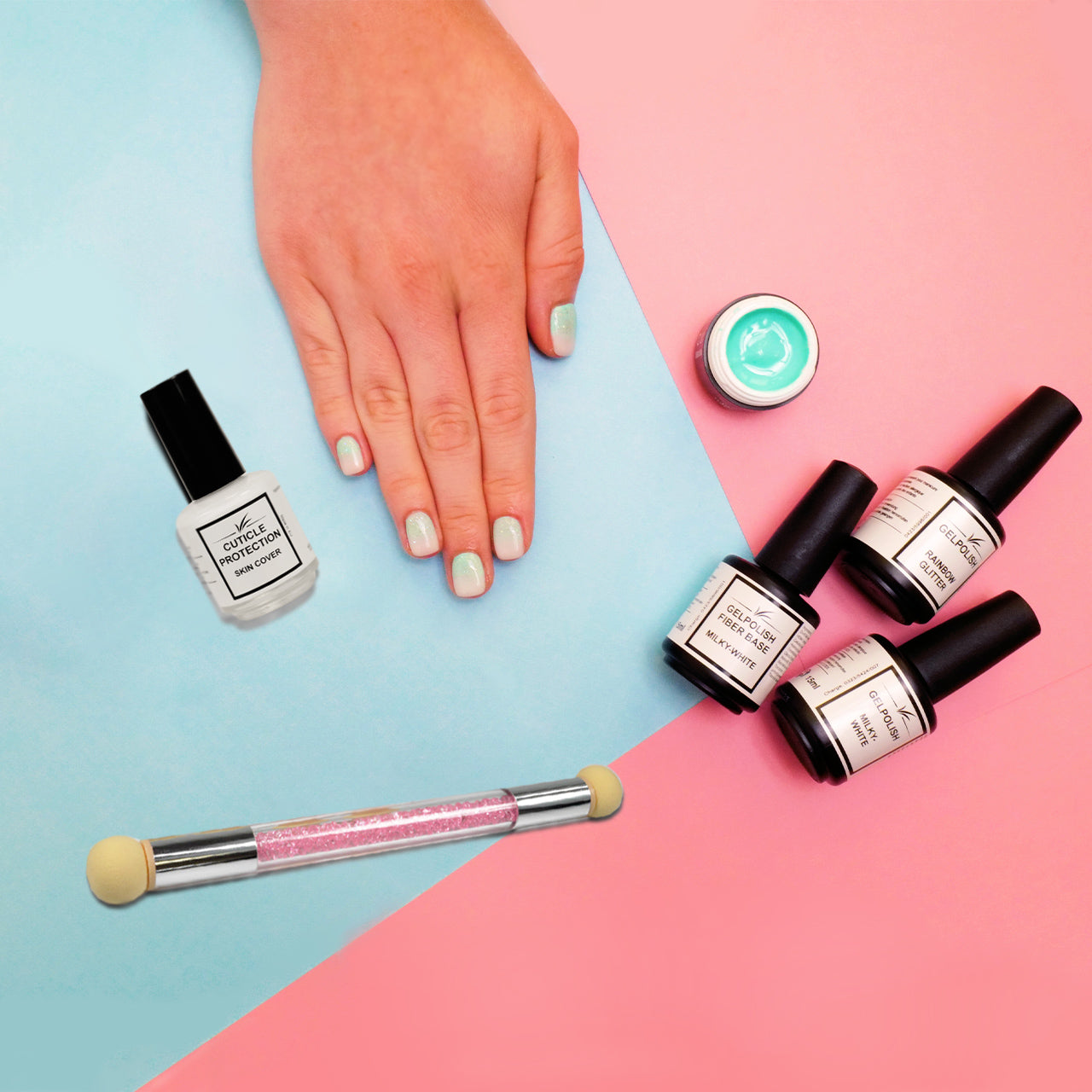 - Etwas GELPOLISH RAINBOW GLITTER auftragen und 60 Sekunden katalysieren -