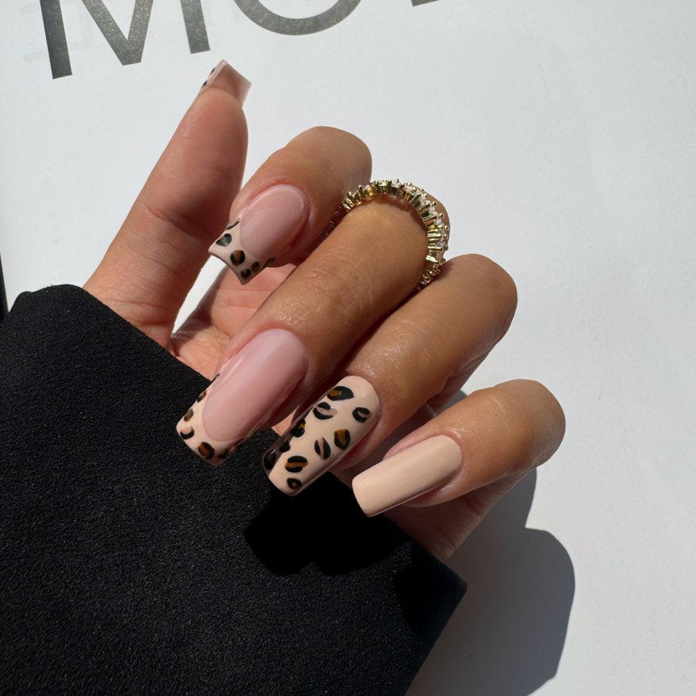 Die klassischen Nuancen von Beige, Braun und Schwarz werden oft verwendet, um Leopardenmuster nachzubilden. Aber auch lebhafte Farben mit metallischen Akzenten können für eine modernere und originellere Interpretation genutzt werden. Sie können die Muster auf dem gesamten Nagel gestalten oder eine Abwechslung schaffen, wie auf dem Foto unserer Botschafterin Céline F.