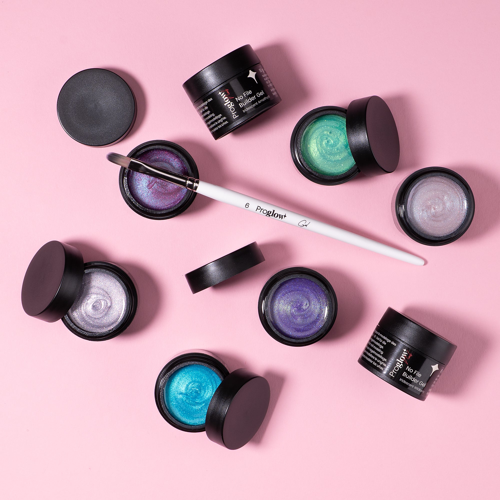 Bei Proglow bringen unsere schimmernden No-File Gele Deine Nägel zum Strahlen: mit feinen Lichtreflexen von zartem Nude über tiefes Amethyst-Violett bis hin zu frischem Mintgrün. Finde hier heraus, wie Du eine No-File Gel-Modellage mit irisierendem Effekt kreierst, die bis zu 3–4 Wochen hält und sich schnell und unkompliziert auftragen lässt.