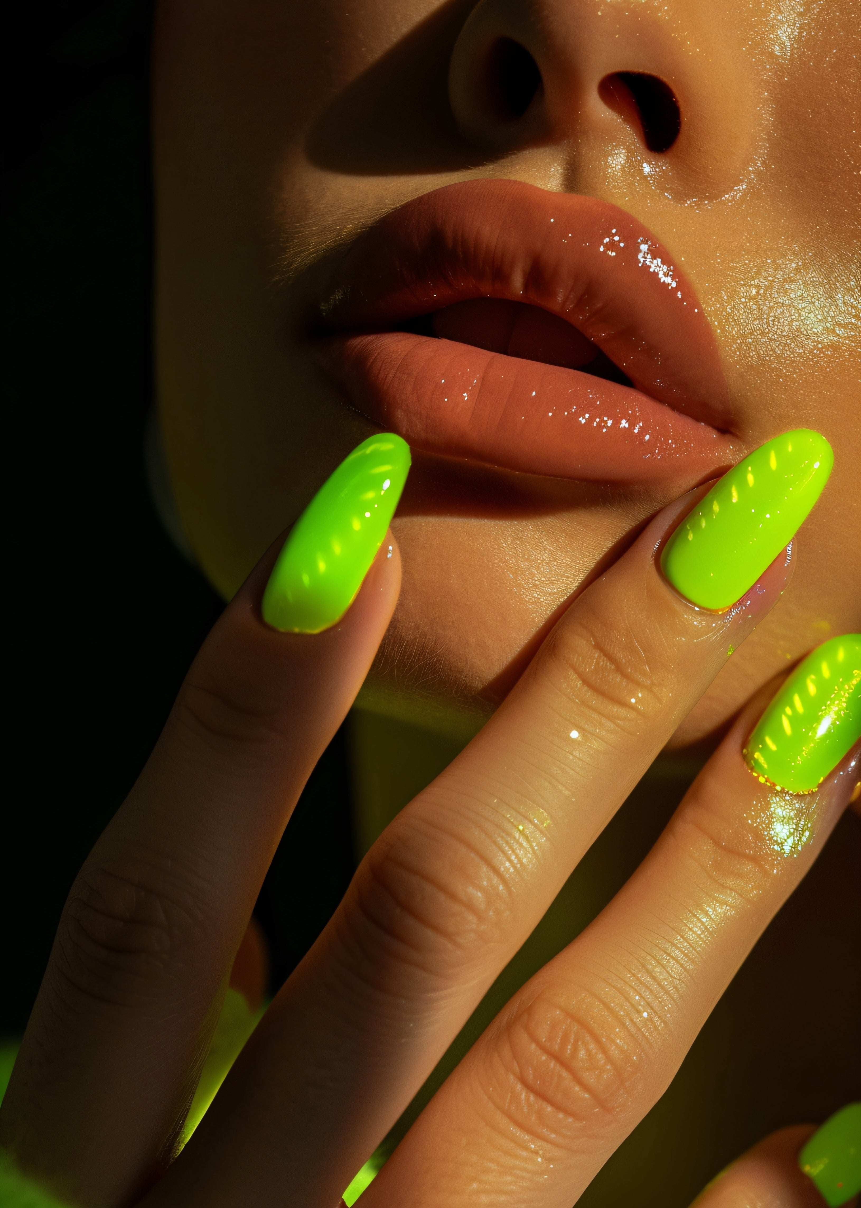 - Green and Gold Nails - Neon-grüne Nägel mit goldenen Akzenten.